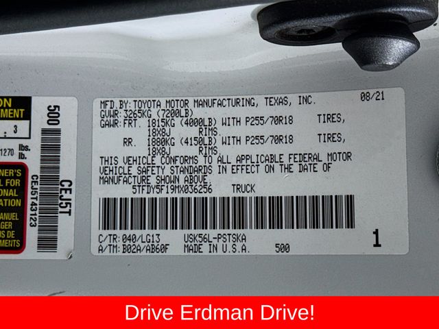 4WD, Black w/Fabric Seat Trim or Fabric Seat Trim w/TRD Off Road/TRD Sport Packages, ABS brakes, Active Cruise Control, Compass, Electronic Stability Control, Heated door mirrors, Illuminated entry, Low tire pressure warning, Remote keyless entry, Traction control. Toyota 2021 Tundra Super White SR5