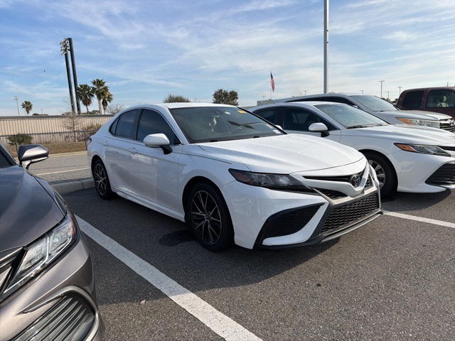 BLUETOOTH, REAR BACK UP CAMERA, APPLE/ANDROID CAR PLAY, LANE DEPARTURE WARNING, LEATHER SEATING, LOCAL TRADE, FRESH OIL CHANGE, Black/Red w/Fabric Seat Trim w/Sport SofTex, ABS brakes, Active Cruise Control, Alloy wheels, Electronic Stability Control, Front dual zone A/C, Heated door mirrors, Illuminated entry, Low tire pressure warning, Remote keyless entry, Traction control. Toyota 2022 Camry White SE